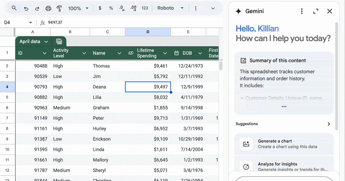 Once enabled, Gemini will understand your sheet’s structure and can generate text based on what you already have or what you ask it to create.