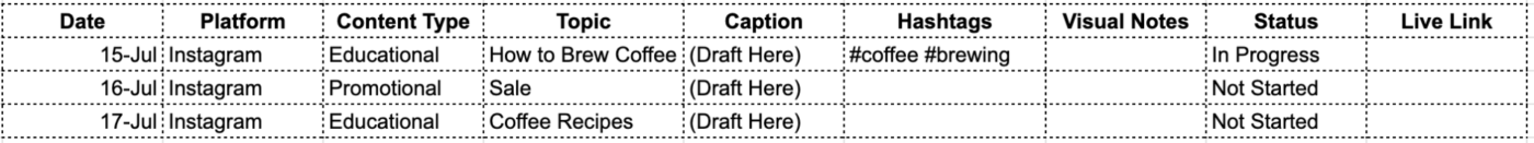 This layout ensures you’re capturing every detail you need to plan, create, and track your social content. It also gives Gemini clear categories to work from when generating ideas and copy.